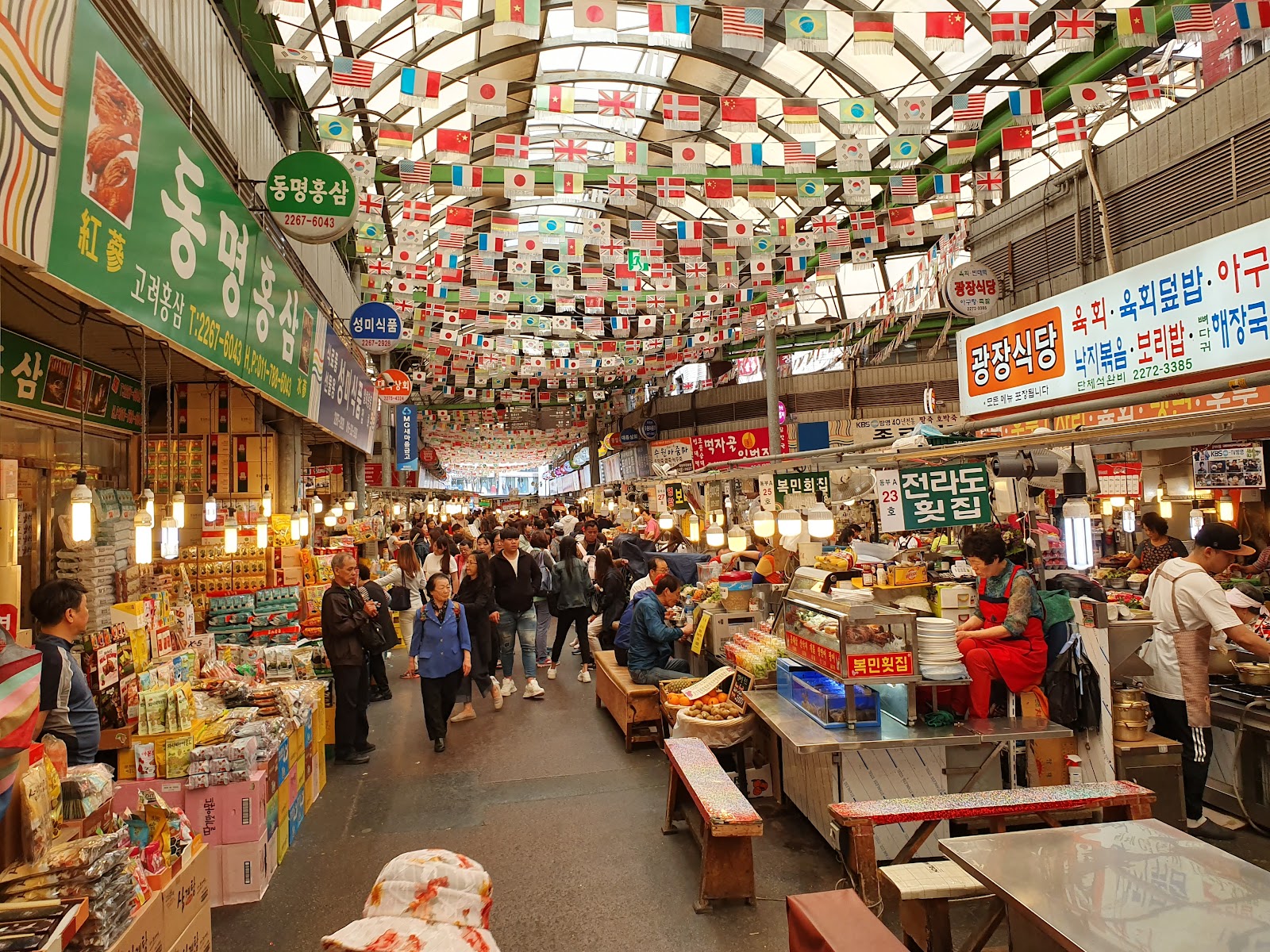 第一,这不是旅游景点,而是首尔当地人真正光顾的地方。工作日中午来看看,你会看到上班族排队买绿豆煎饼,大妈们成打地买药紫菜包饭。
